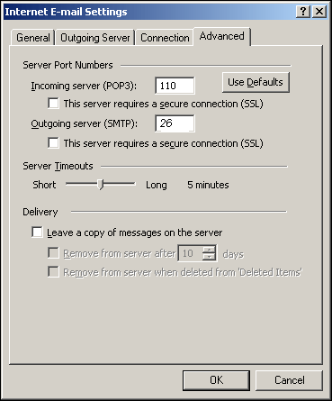 verify that the Incoming server (POP3) is set to 110 and the Outgoing